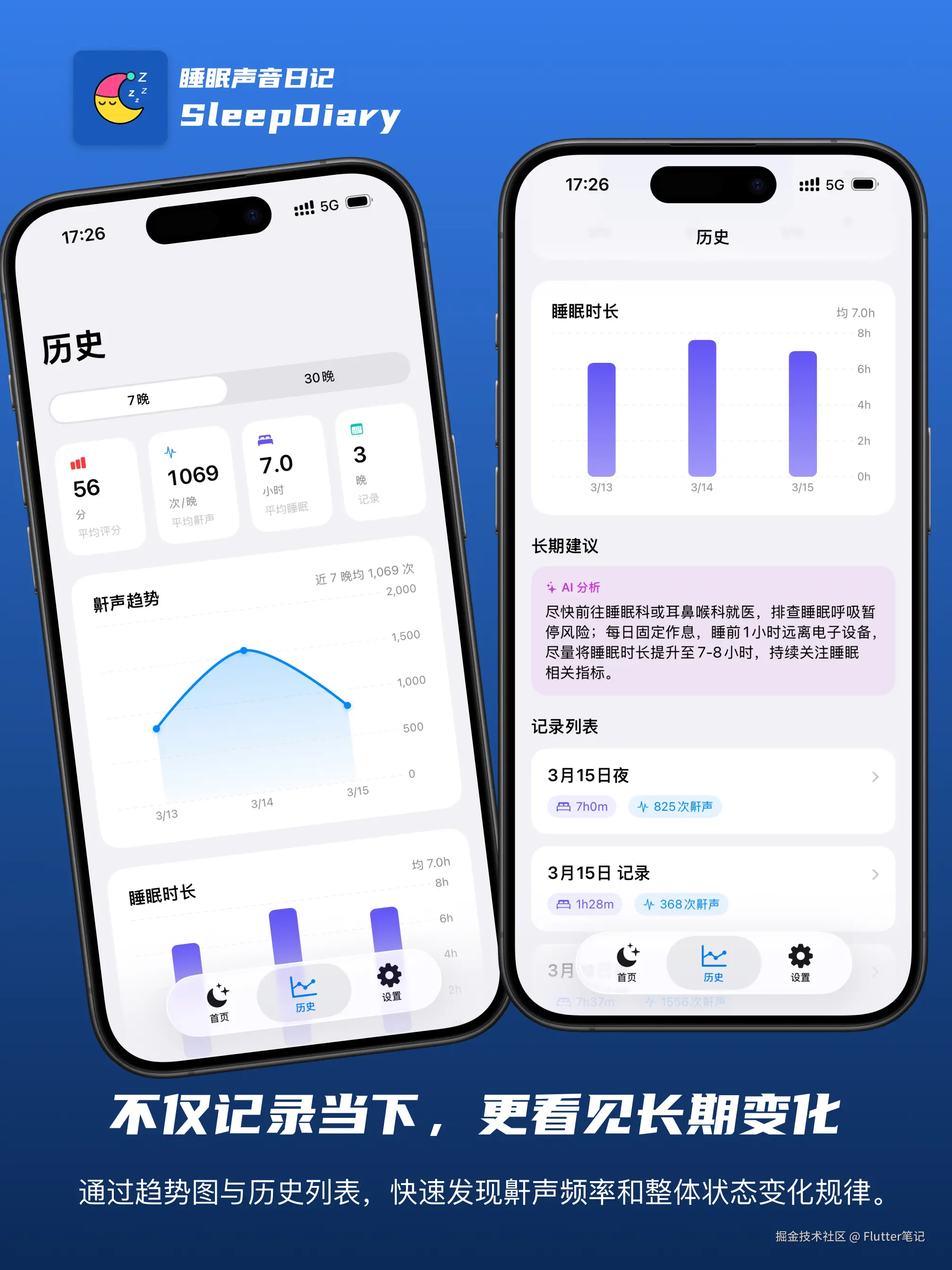 历史页面还有基于多晚数据的趋势分析,能发现长期规律。如果鼾声连续多晚偏重,会主动建议用户去做专业评估。