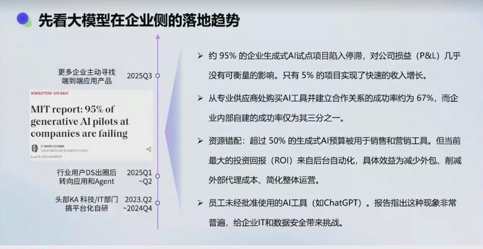 - 95% 的企业 AI 落地失败:MIT 调研显示,过去一年多超过 95% 的企业侧 AI 落地项目失败,只有 5% 的企业在 PNL(损益表)上看到了 AI 的价值