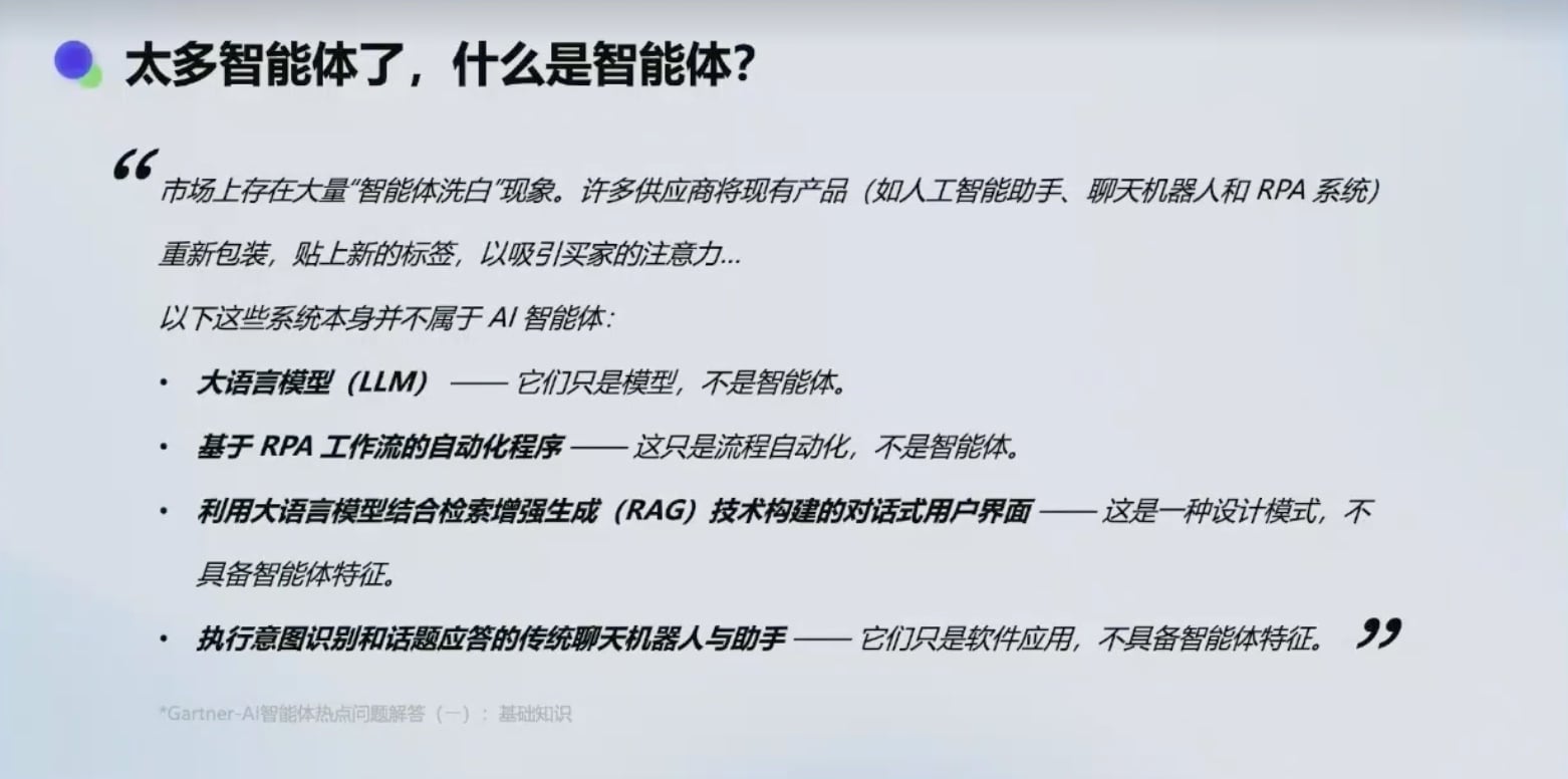 - 智能体洗白现象:许多低代码产品、RPA 产品重新包装为智能体概念