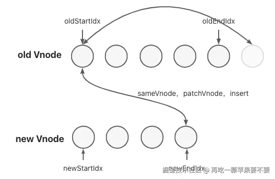 新老两组VNode节点的左右头尾两侧都有一个变量标记,在遍历过程中这几个变量都会向中间靠拢,oldStartIdx > oldEndIdx或newStartIdx > newEndIdx时结束循环