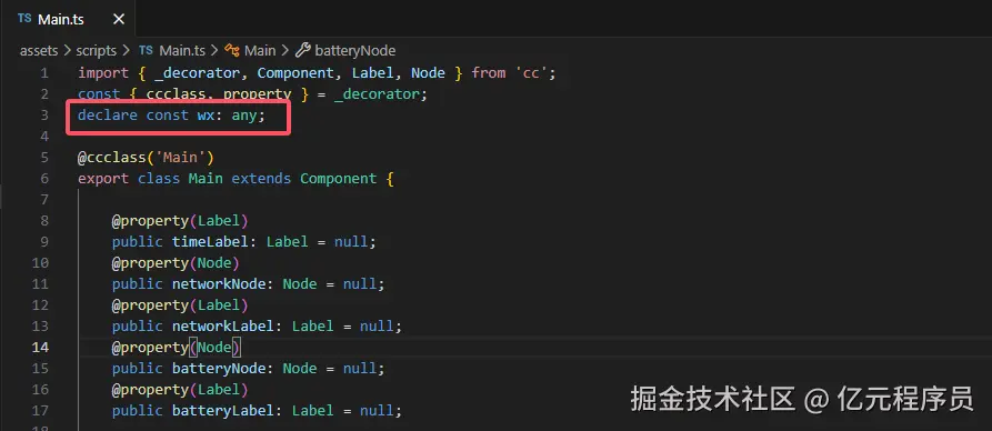 首先创建一个Main脚本,因为本次演示环境是微信小游戏,所以我们声明一下declare const wx: any; 使用微信的API