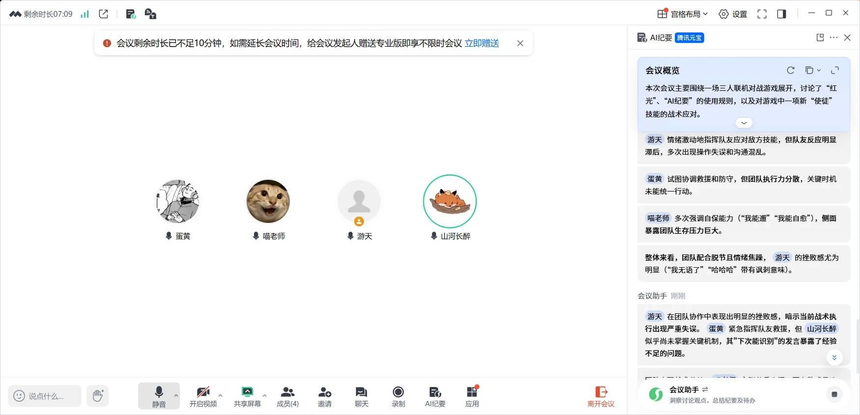 ▲ 双方情绪明显失控|腾讯会议开黑 + AI会议纪要记录了玩家实时的状态