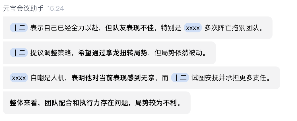 但这个整理,相当有仪式感。听听这词儿,「生存压力巨大」、「明显的挫败感」。 哪怕玩家们在麦里吵翻了天,在腾讯会议的 AI 眼里,这可能仍然是一场关于战术执行,与团队配合的「高层对话」。
