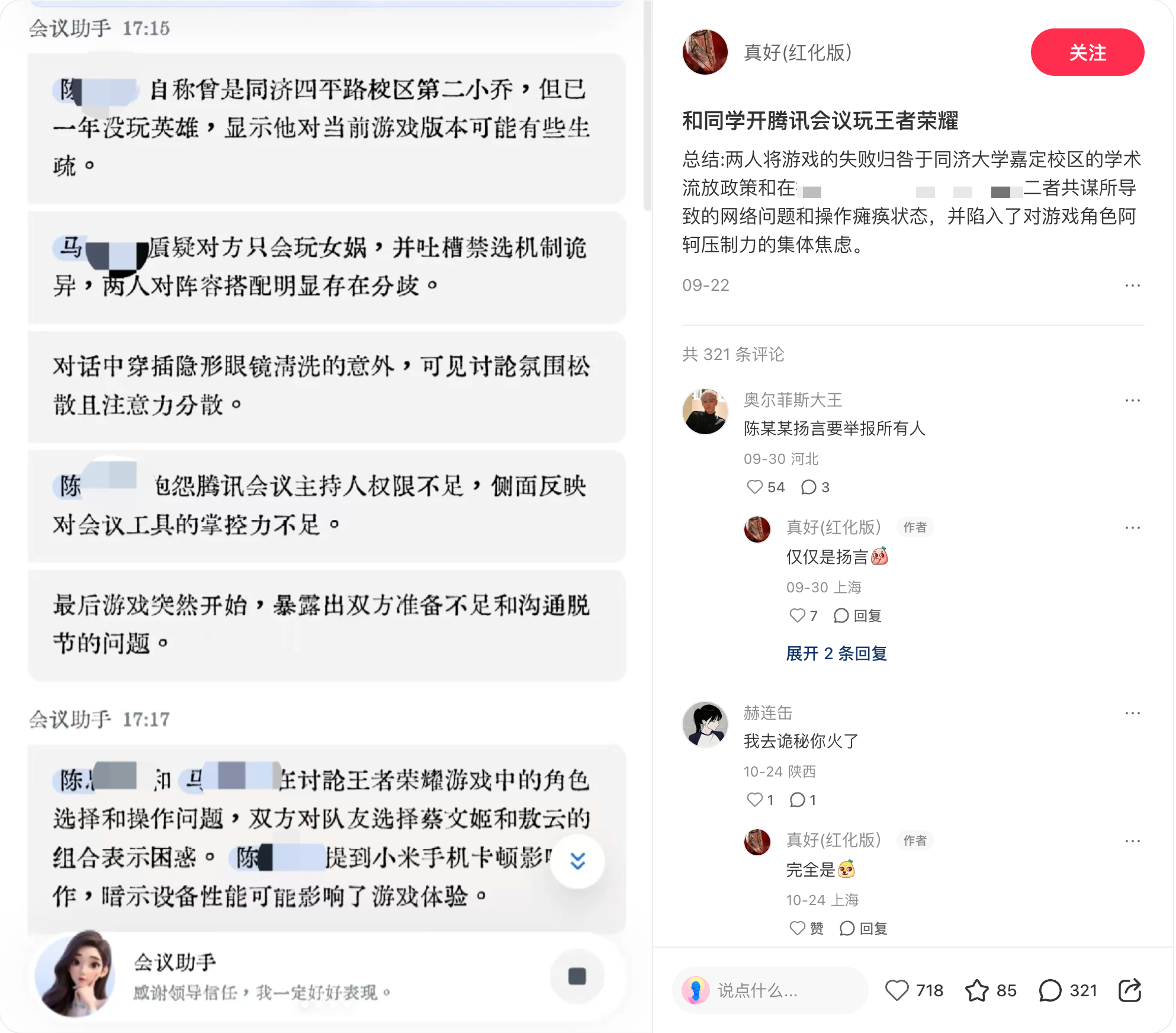 有网友在小红书上分享,在腾讯会议里开黑,明明是打游戏打急眼了,在那互相甩锅。结果 AI 纪要一出,瞬间给升华成了各种职场官方话。
