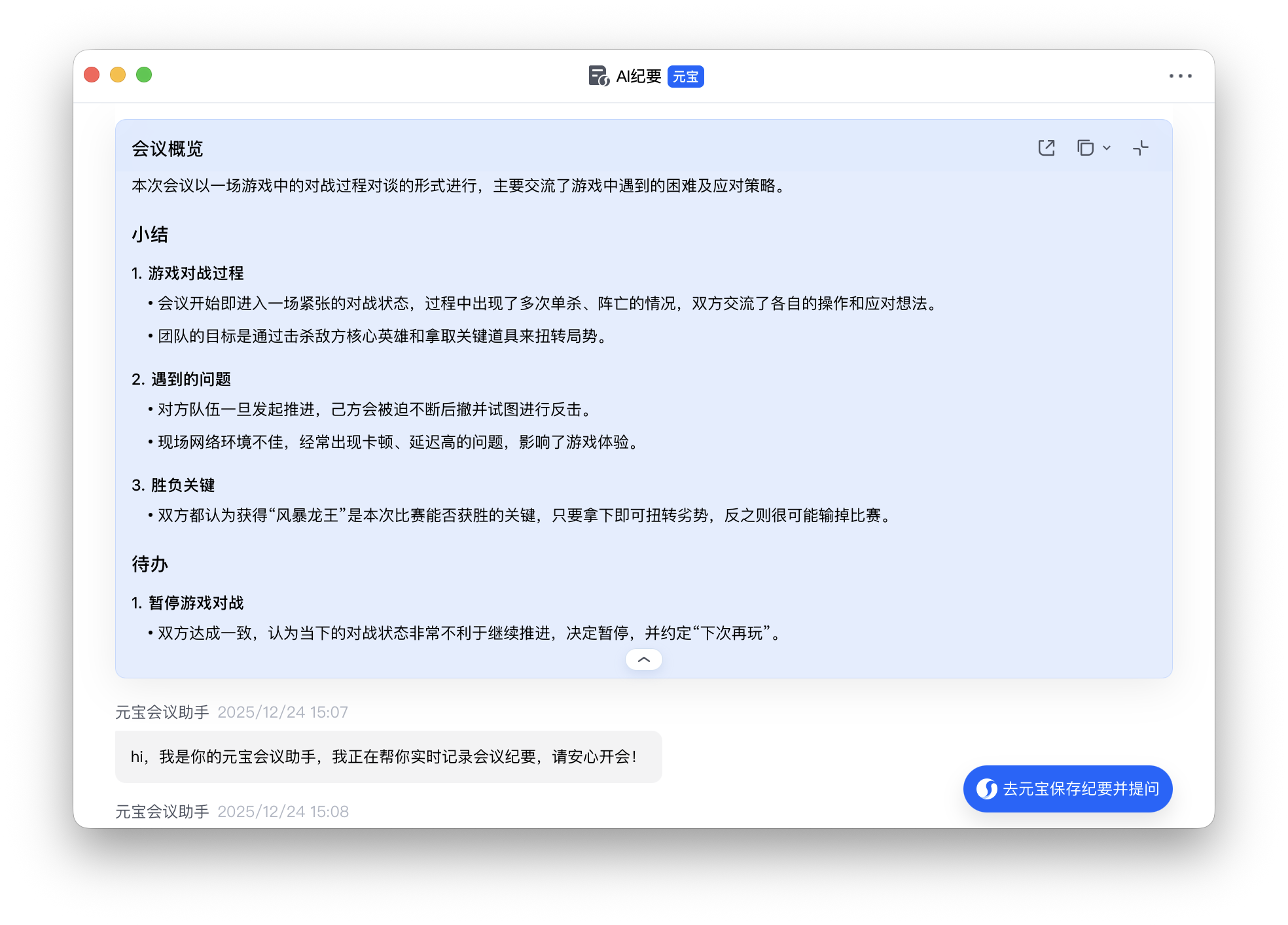 以前打完一局,想分锅可能要再吵吵个半天。现在好了,也不需要我们手动整理,一边看乐子,一边手直接把纪要甩给元宝。