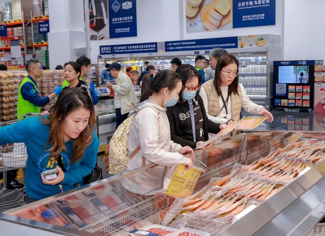 生鲜区尤其热闹。两排红彤彤的澳洲牛肉整齐铺开,切面漂亮;挪威进口的三文鱼,颜色鲜亮。新出的Member’s Mark榴芒班戟试吃点前,已经排起了不短的队。等不及的孩子,会直接把大大一盒放进购物车。
