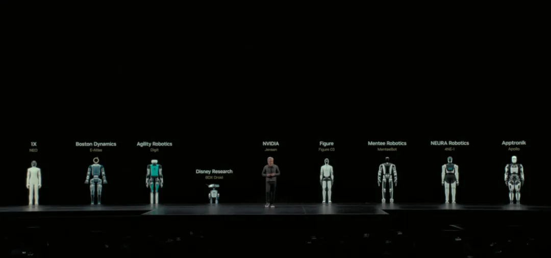 黄仁勋还提到了一些机器人公司。如机器人明星公司 Figure AI 与英伟达合作,训练了其 Helix 视觉语言动作模型。Agility Robotics 的通用人形机器人 Digit,也借英伟达的 Isaac Lab 框架进行强化学习训练,优化步态控制、抗扰恢复等技能。