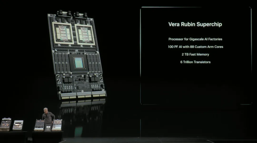 黄仁勋 GTC 大会台上展示下一代 Vera Rubin 超级芯片|图片来源:英伟达
