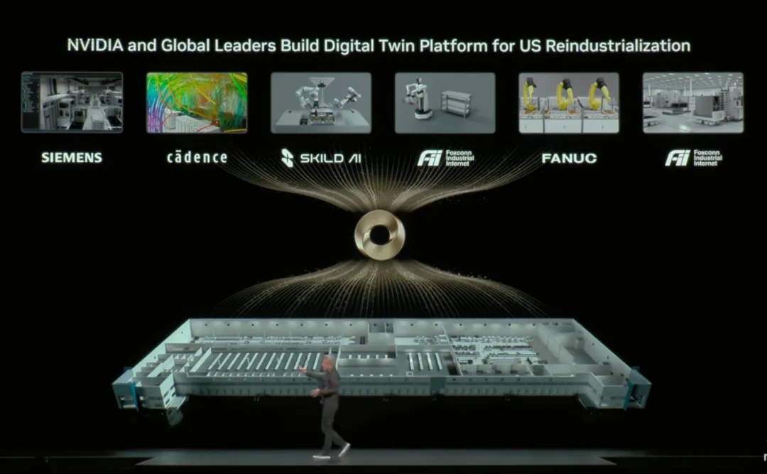 发那科和富士康工业富联是首批支持基于 OpenUSD 构建其机器人数字孪生模型的制造商。黄仁勋在 GTC 大会上展示了富士康在德州休斯顿新建的 24 万平方英尺工厂,据称在现实动工之前,整座工厂的产线、机器人与物流在真实物理与实时数据中被反复推演,先在虚拟世界把良率与节拍调优,再在现实中落成。