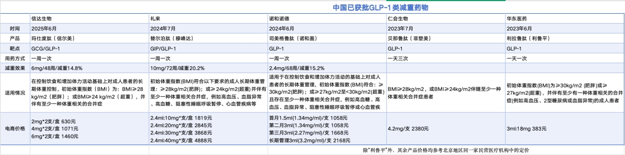 国内已获批GLP-1减重药物(数据源于公开信息)