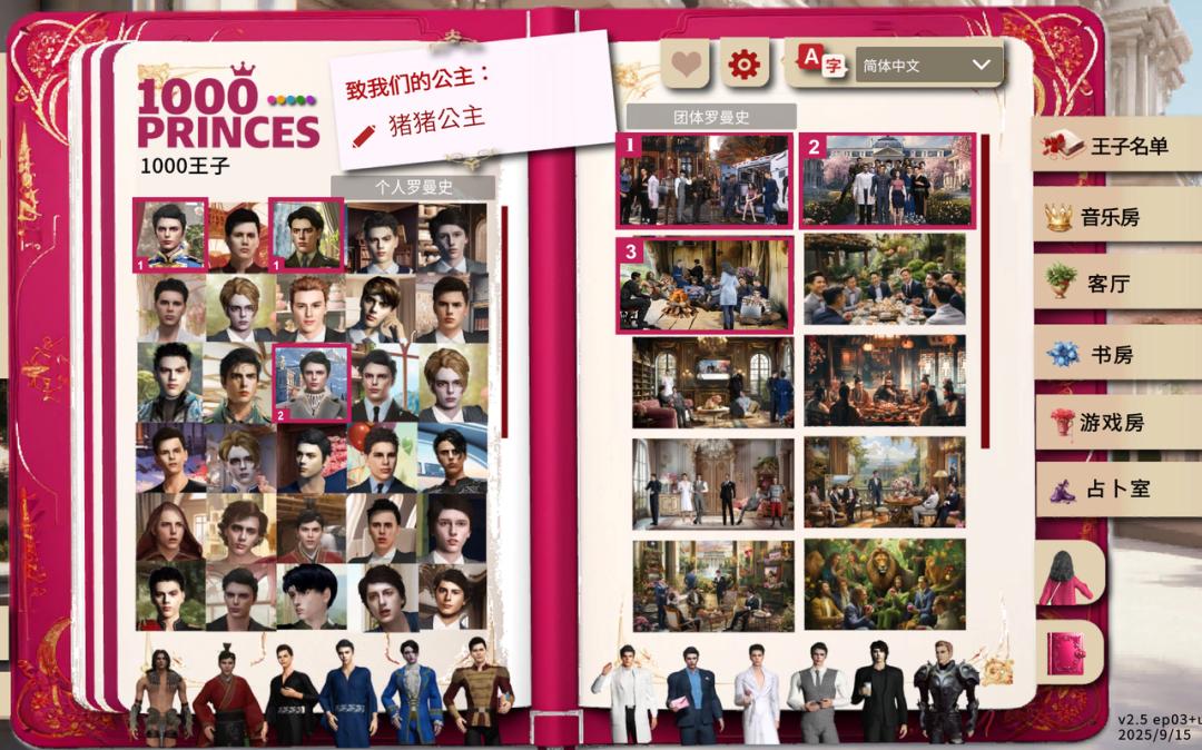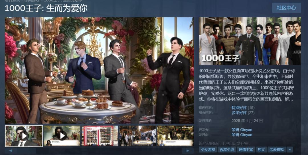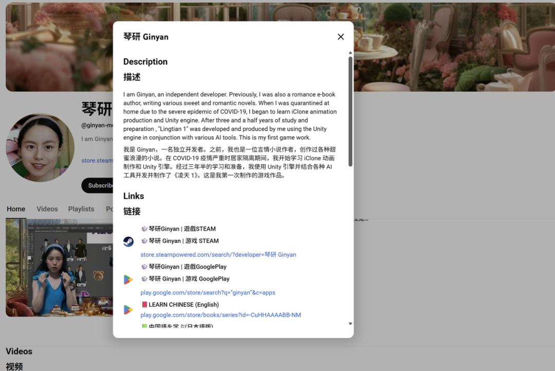 “琴研Ginyan”——我找到了这个游戏的作者。她的Youtube页面介绍她为一名独立开发者,之前也是一位言情小说作者,“创作过各种甜蜜浪漫的小说”(比如我看到她在2017年发布小说“纸短情长: 黑帮大佬的深爱罗曼史”);在疫情居家期间学习了AI工具并制作游戏。24年10月在Steam发布了《凌天1~妳的命定王子DEMO》,随后25年1月发布《1000王子:生而为爱你》。
