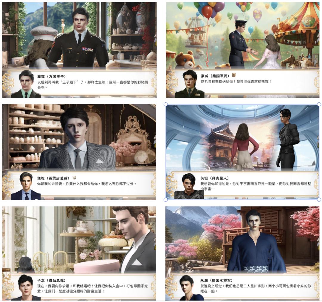 在琴研的陈述中,她最早接触到的乙女游戏是来自日本voltage公司的《Love365》,可以称之为她的乙女游戏启蒙导师,“我当时就痴心妄想要是我以后也能做一个类似的这样的乙女游戏综合App就好了啊。”《恋与制作人》也让她着迷,但她不喜欢纸片人,所以在看到《恋与深空》的建模和动画时,被深深打动了。“当时我也正在制作《1000王子》,我感觉到了望尘莫及的压力。”琴研说《1000王子》就是面向喜爱罗曼史的女性玩家所制作的乙女游戏,“如果妳像我一样爱读言情小说或者爱看言情偶像,那麽妳也很可能会喜欢玩乙女游戏,很可能会喜欢《1000王子》。”