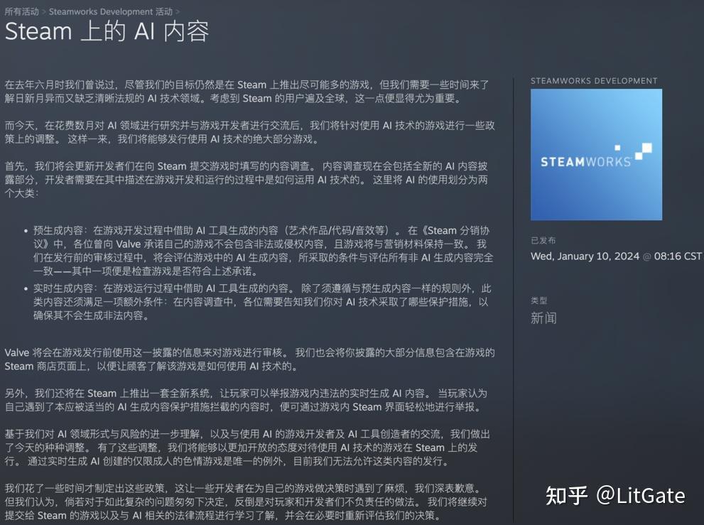 而Steam这个全球最大的PC数字游戏发行平台,也展现出了对AI创作游戏的接纳与包容,从2024年1月开始能够发行使用AI技术的绝大部分游戏,只要合规。