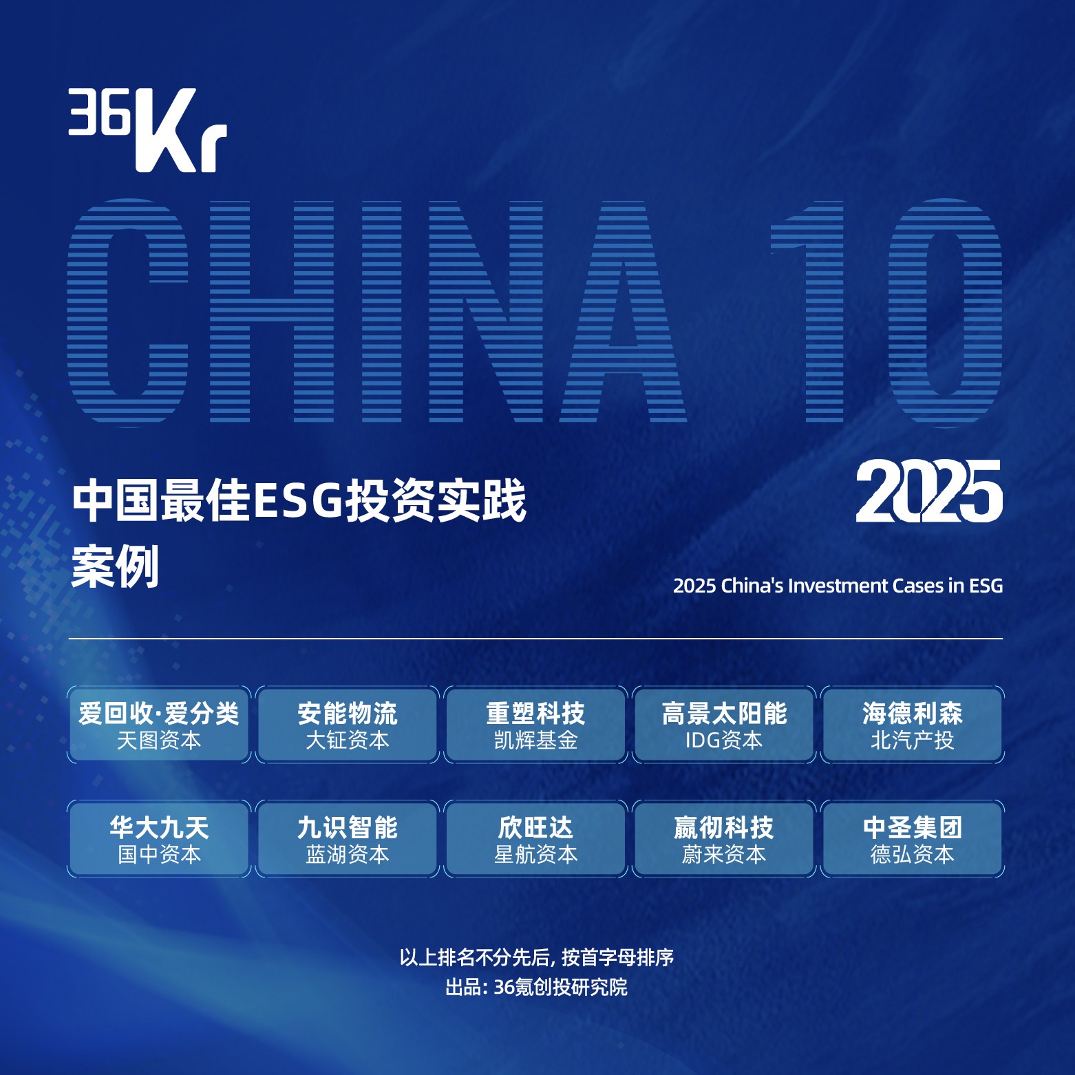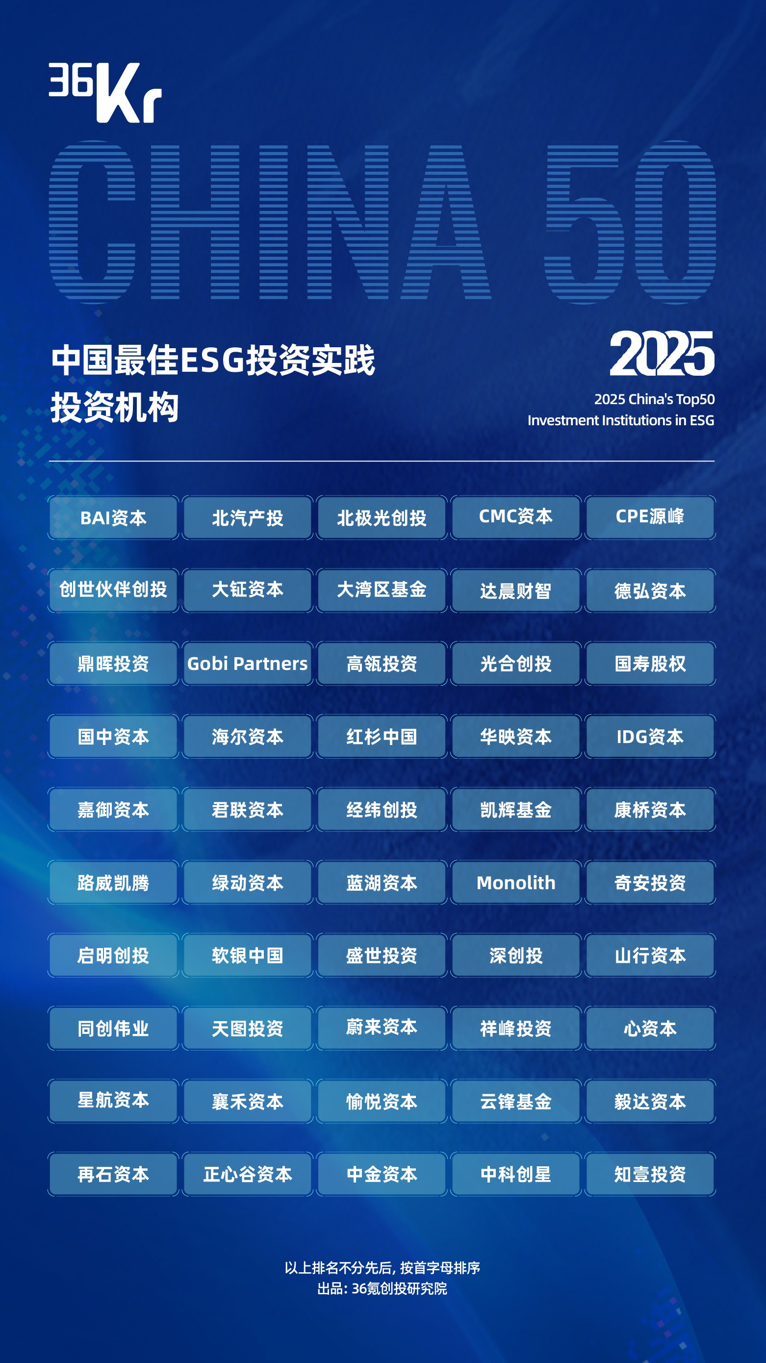 综合投资机构基础硬数据(即管理规模、投资业绩、退出表现),以及其在ESG实践的六大核心维度(包括:ESG管理委员会情况、ESG原则指导投资的具体表现、对被投企业的ESG投后赋能、ESG代表案例的商业影响力、机构及成员ESG相关证书、其他ESG相关公益行动)。我们最终遴选出36氪2025年「中国最佳ESG实践投资机构 TOP50」。