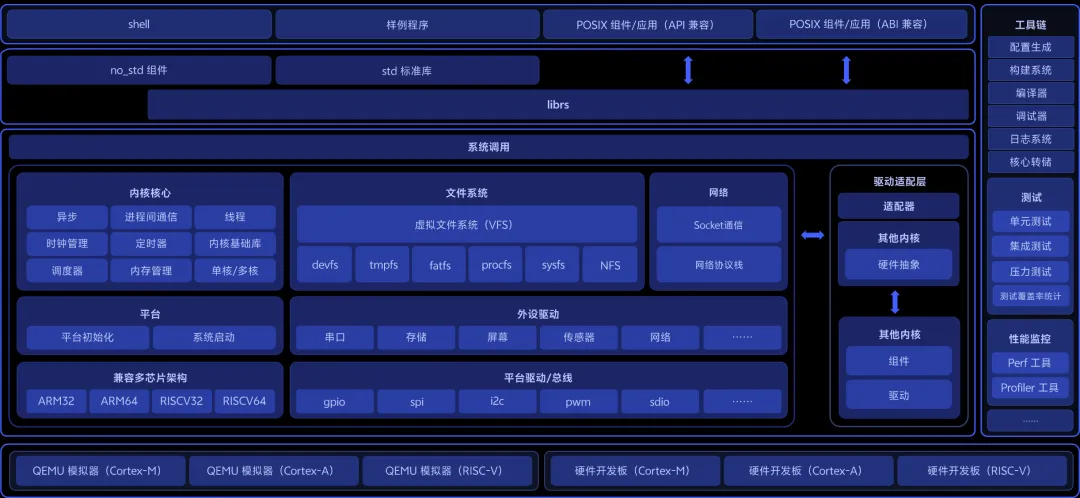 为保证系统扩展性,BlueKernel 通过硬件抽象等一系列方式,提升了对于 CPU 架构和驱动的兼容能力,支持 Rust 语言开发驱动,也支持兼容已有的 C 语言内核的外设驱动。因此,开发者和生态内的厂商既可以继续使用现有的 C 语言驱动,也可以用 Rust 语言为新硬件编写新驱动,这种分阶段的投入,降低了整个行业的进入门槛。
