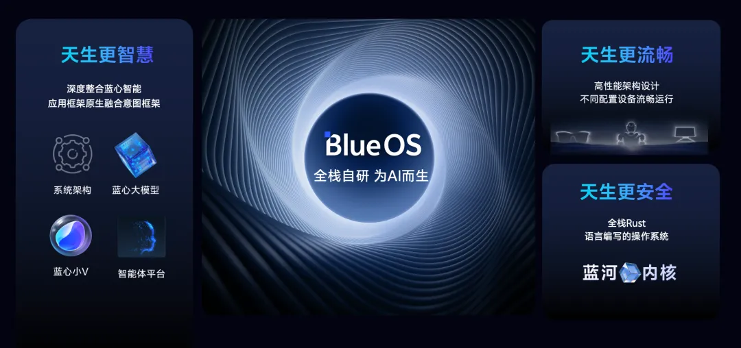 安全上,蓝河操作系统全栈使用 Rust 语言,从源头保障内存安全。AI 能力上,蓝河操作系统的系统架构设计深度融合蓝心大模型,Agent 框架具备跨场景感知、自主决策等能力。运行流畅方面,蓝河操作系统构建了一系列高性能技术,能高效利用软硬件资源。