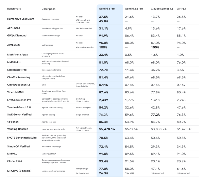 -推理能力:官方强调 Gemini 3 Pro 在 Humanity’s Last Exam、GPQA Diamond、MathArena 等一堆高难度推理和数学基准上,全部刷出了新高分,定位就是「博士级推理模型」。
