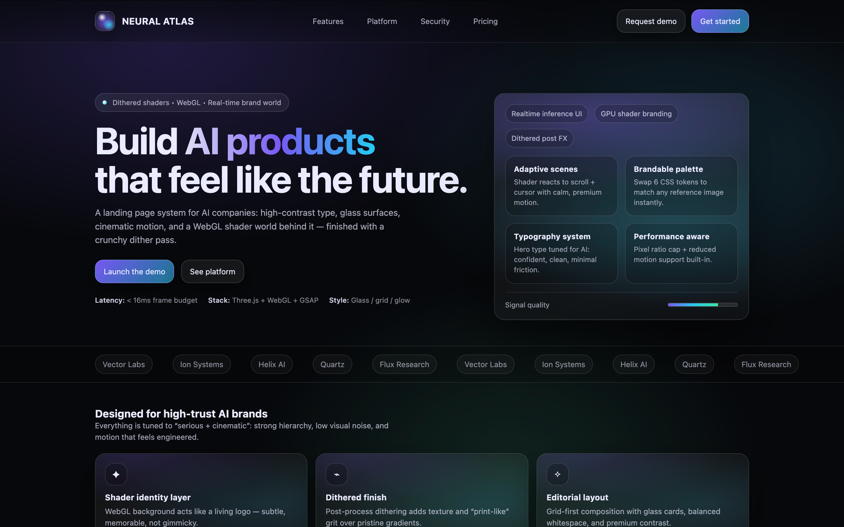 ▲提示词:You are the top 0.1% designer and developer for the world’s cutting-edge innovation on front-end design and development. You are tasked to create a full landing page with {Dither + Shaders} using {WebGL + ThreeJs} in the styling of an uploaded image for the AI company. – Focus mainly on the design part, not the development. Import all necessary files and libraries: Three.js、WebGL、GSAP、Any other animation libraries related to 3D development.