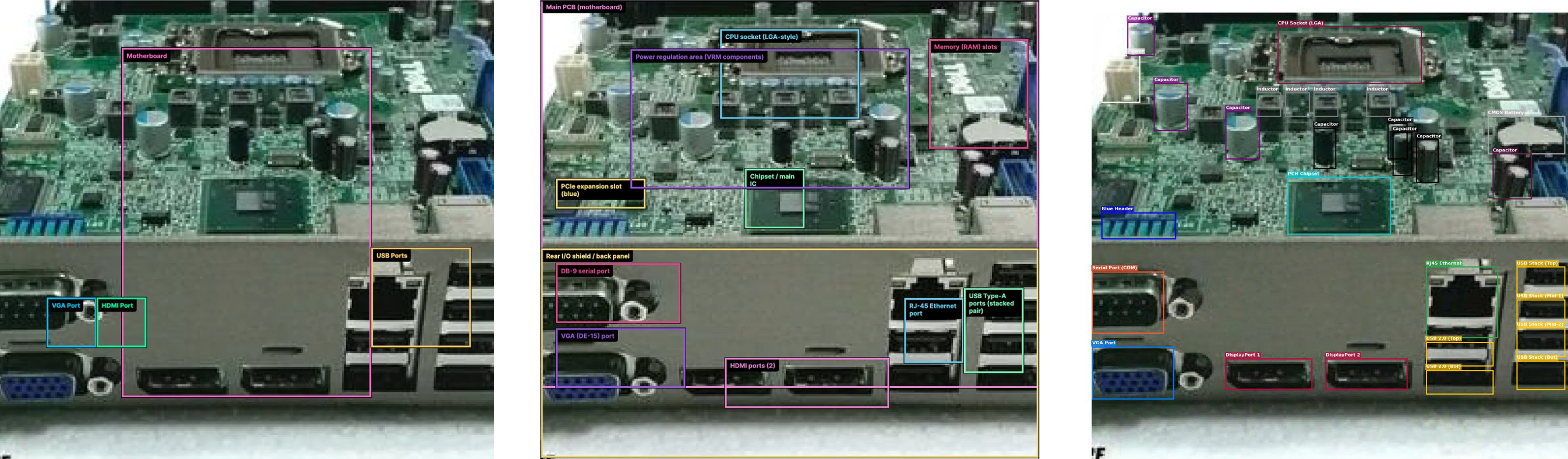 并且它给出了一个例子,是给一块看起来很模糊的主板,用 AI 加上一些带有方框的标记;对比 GPT-5.1,GPT-5.2 虽然也会犯错,但是标记了更多的地方。