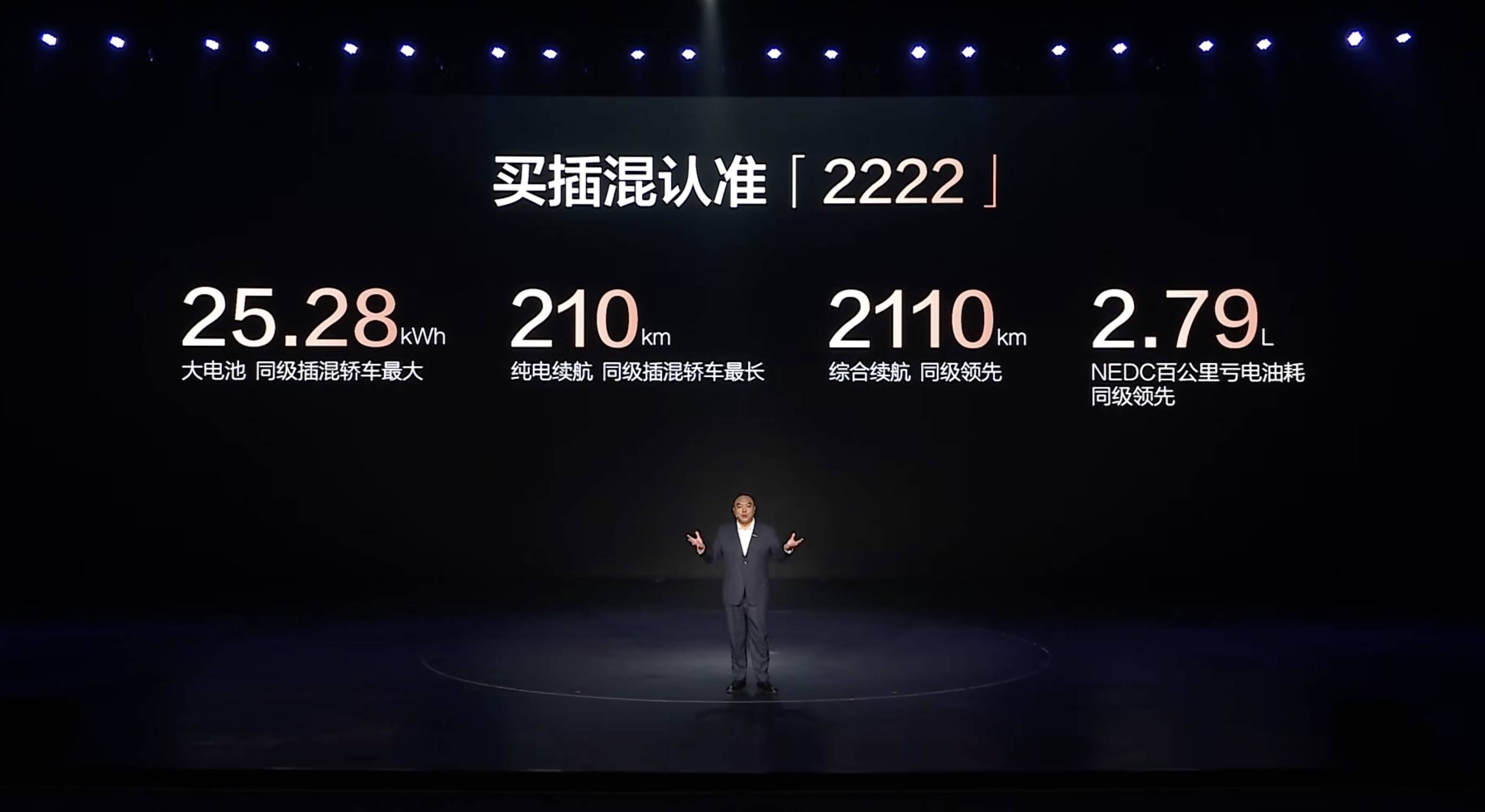 比亚迪在发布会上列出了一组数据,说是「四个 2」:25.3 度的大电池、210 公里的纯电续航、2110 公里的综合续航,以及 2.79 升的百公里馈电油耗。