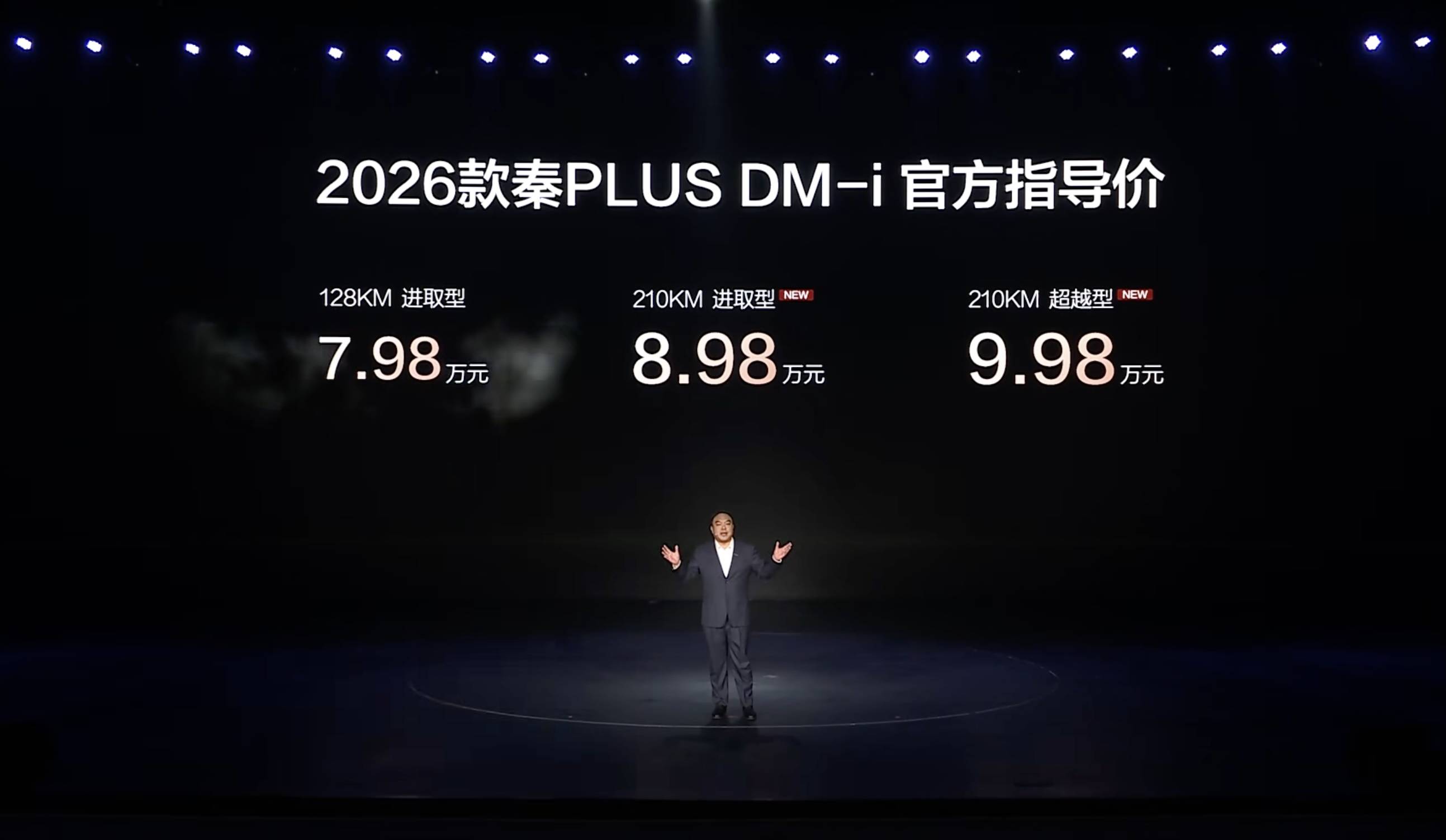 定位稍低的 2026 款秦 PLUS DM-i 杀价更狠,210km 进取型直接下探到 8.98 万元,这意味着 200 公里以上长续航插混轿车正式进入 8 万元时代,其 128km 版本的起售价则依然维持在 7.98 万元。