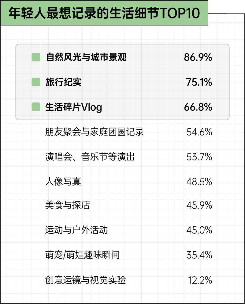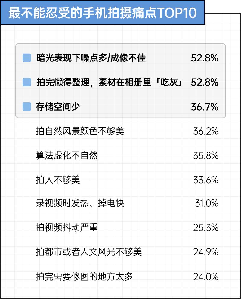 现在的年轻人,似乎更喜欢“随手一拍”的松弛感——这不代表他们对出片没有要求,相反,他们追求的是足够的便捷性,以及随手拍出“高质大片”的痛快。相比而言,手机确实难当大任了。在年轻人最不能忍受的手机拍摄痛点TOP10中,画质和便捷性是两大核心问题。