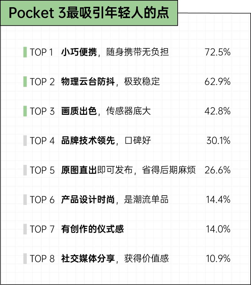 在调查中,年轻人也将“稳定外挂、画质升级和解放手机”列为TOP3的Pocket 3产品种草点,无论如何,一台独立的拍摄设备,放大了生活记录这一需求,给了用户更多心无旁骛、沉浸于当下创作的机会,其背后的情绪价值感是不言而喻的。