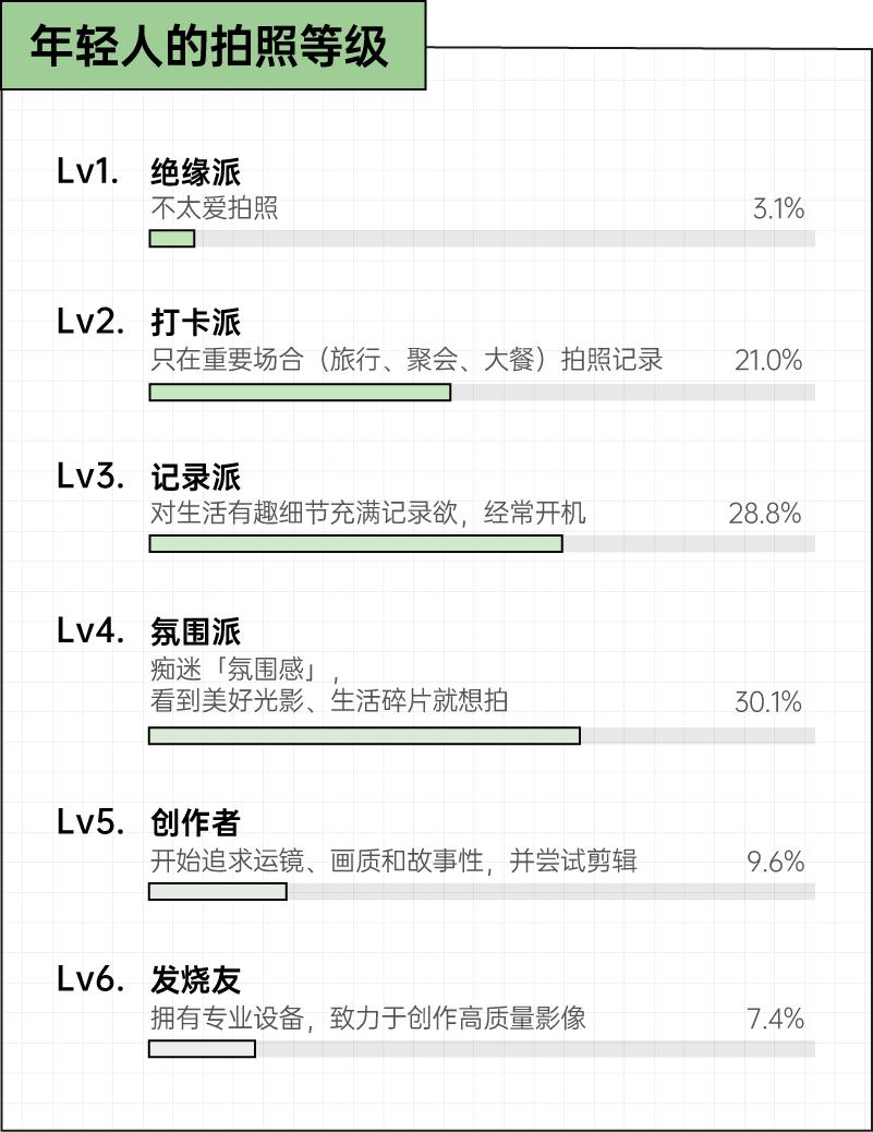 每到聚餐,“手机先吃”似乎已成常态;各种社交媒体上,出片的教程也是层出不穷。“记录生活”已成为年轻人的新刚需,当我们把拍照这件事拆分成从Lv1到Lv6的六个层级,发现年轻人对影像的追求出现了清晰的分层。