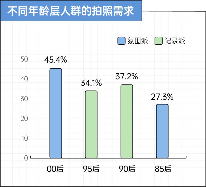 不同年龄层的拍照需求也各不相同,我们发现,数字原住民00后近一半都是“氛围派”。