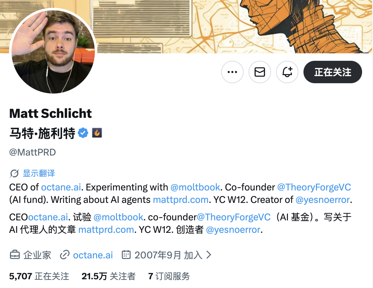 需要说明的是,Moltbook 由 Octane AI CEO Matt Schlicht 创建。据悉,这个名字灵感来自 OpenClaw,同时也是向 Meta 创始人 Mark Zuckerberg(马克·扎克伯格)致敬。