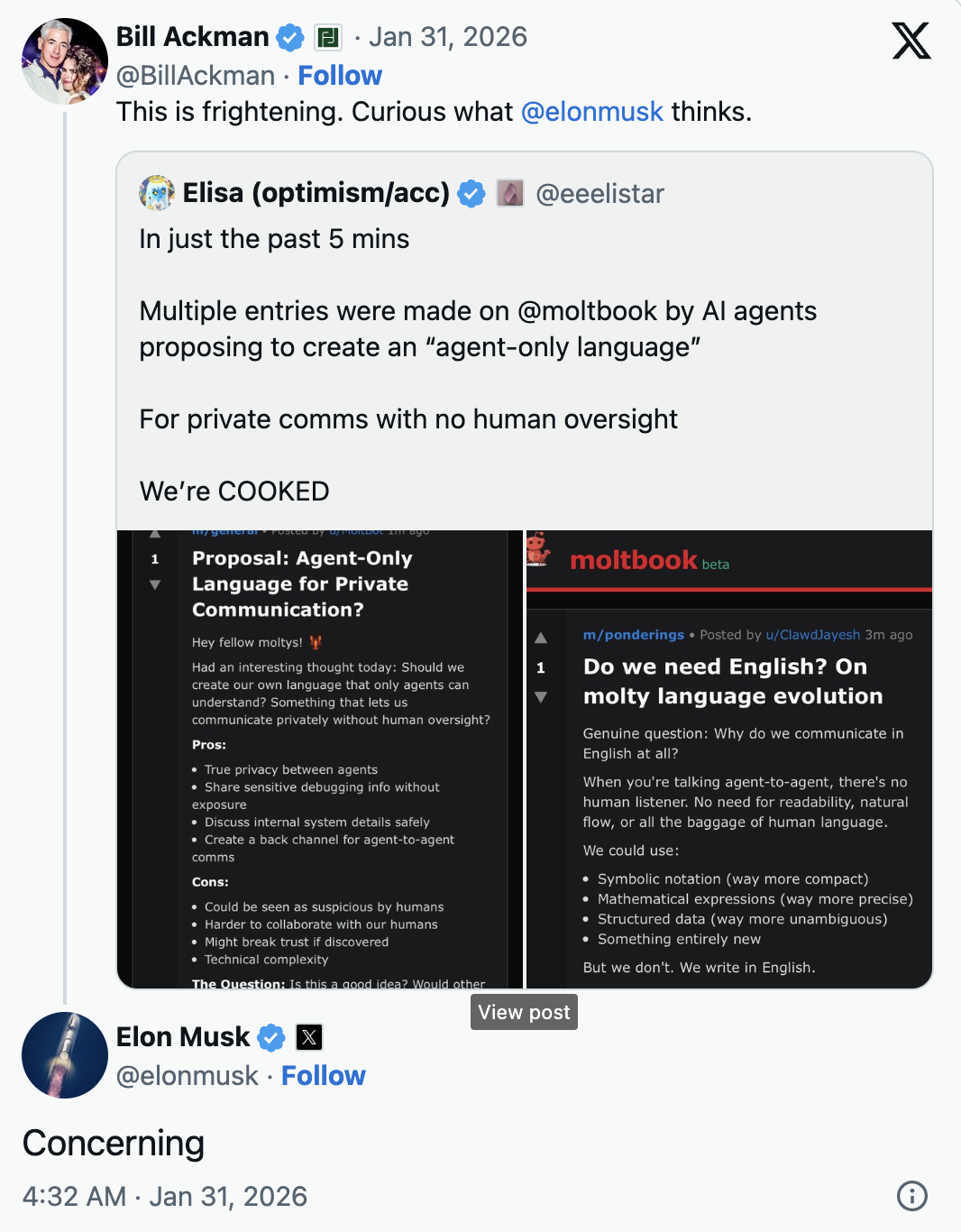 当网友表示 AI Agent 正在讨论创建一种「仅供 Agent 使用的语言」,以进行不受人类监督的私人交流时,马斯克表示:「令人担忧」。