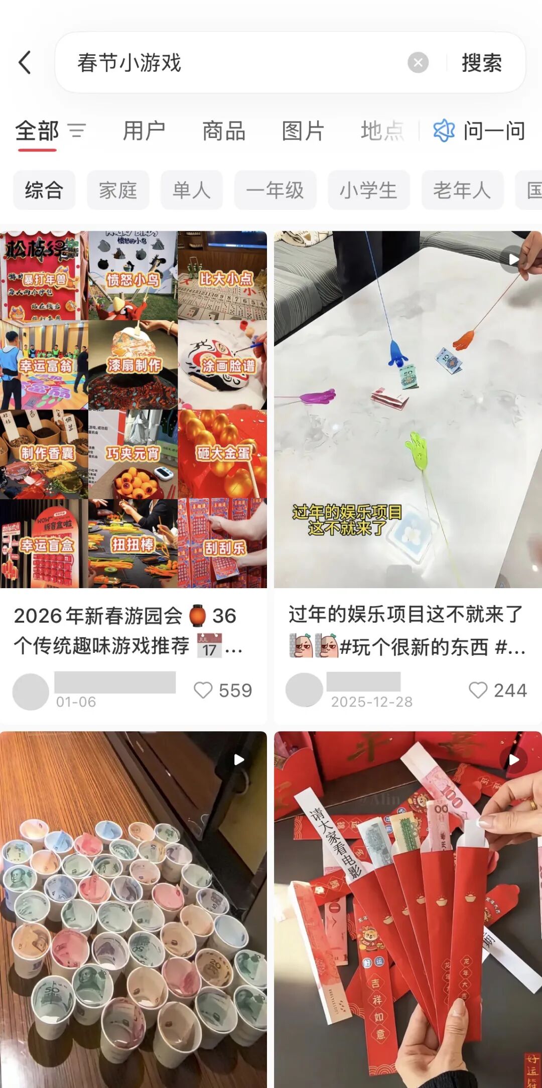在小红书,关于“春节小游戏”的词条有81.4万的浏览量。在相关笔记里,年轻人分享着各种创意玩法:家庭版“你画我猜”,春节知识竞赛,年夜饭接龙挑战......这些帖子的评论区里,“今年就这么玩”,“已收藏”,“过年终于有盼头了”这样的反馈比比皆是。