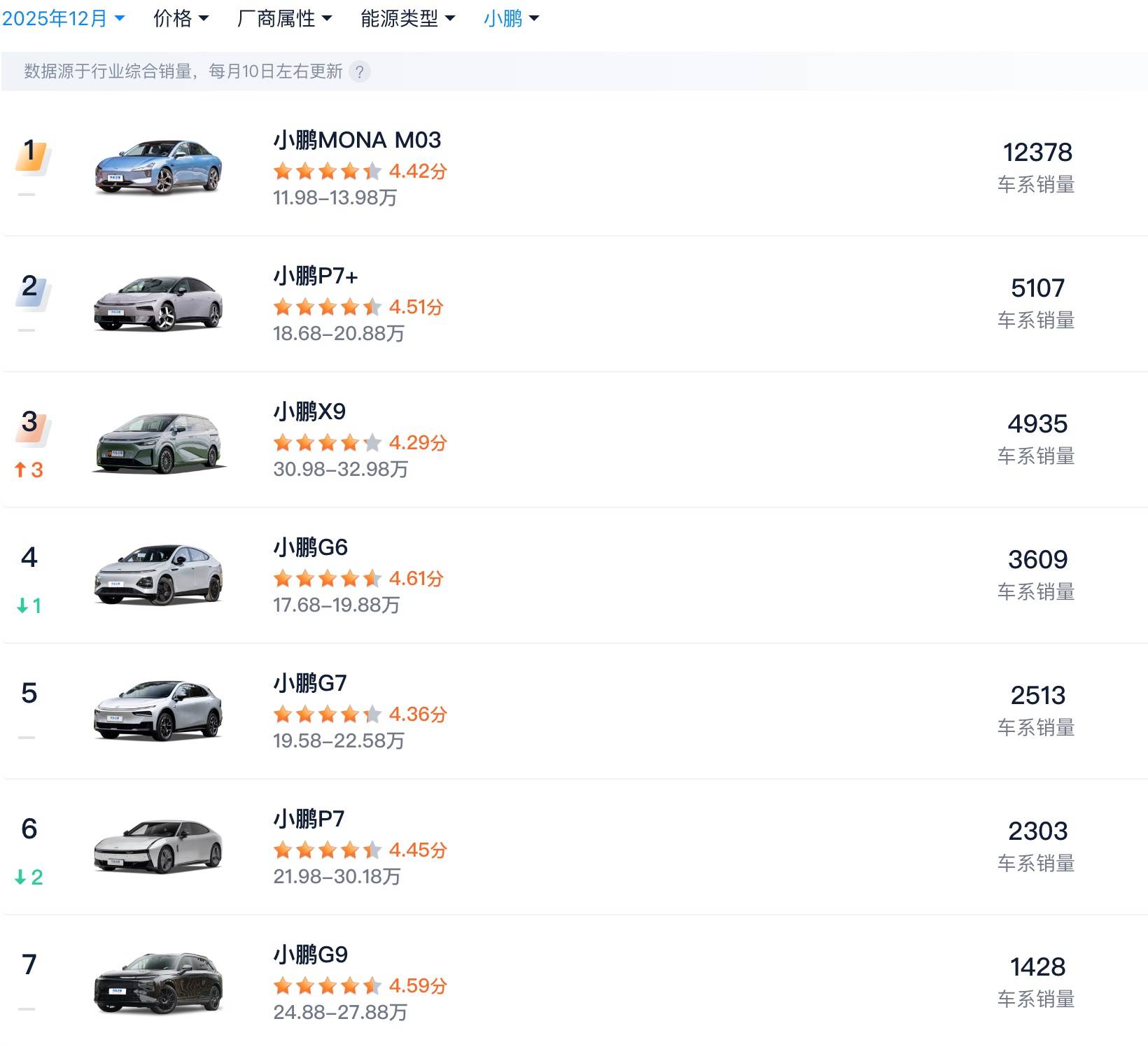 ▲ 2025 年 12 月小鹏各车型销量 数据来源:汽车之家