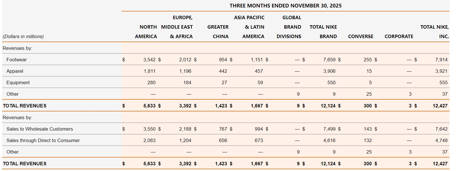 2026财年第一季度(2025年6月至8月),耐克批发渠道回暖,经销商业务同比增长7%至68亿美元,成为当季营收增长的主要来源,整体库存也同比下降1.68%至81.14亿美元。