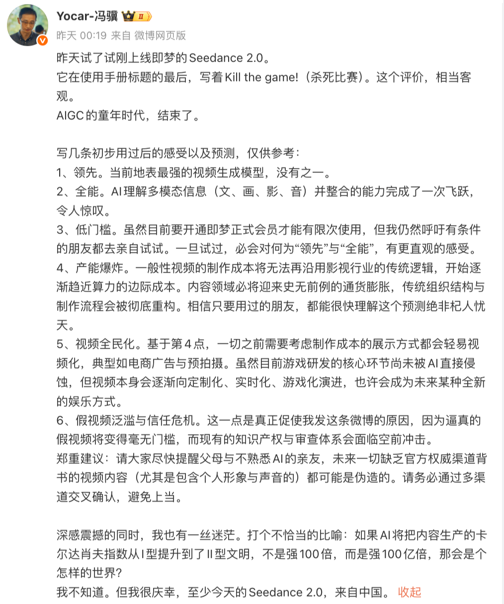 「来自中国的 Seedance 2.0 将成为最先进的技术。」