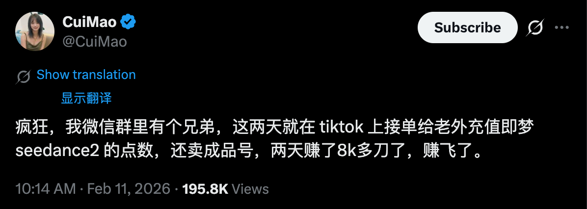 除了一反常态的,是海外网友在找 +86 号码,注册即梦;还有大量的网友发帖子找攻略,在那些 AI 视频的评论区,都在求体验教程。更有甚者,说是倒卖即梦积分两天赚了 8000 多美元。