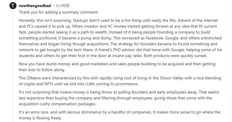 一名投资人称“这并不奇怪。当风投热钱追逐每一个泡沫概念时,创业的本质就变了——它不再是构建持久的事业,而是一场‘拉高出货’的游戏。谷歌、FB等巨头们用收购代替招聘,这让创始人的策略变为:创业、运作人脉、等待被收购。我认识的一位导师曾两次帮学生这样操作,项目只为换取谷歌高薪,随后便被废弃。如今,是‘傻钱’和销售人员在主导创业,目标从创造变成了套现。”