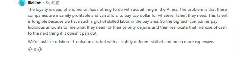 一位业内人士表示:“‘忠诚已死’与AI收购性招聘无关。问题在于这些公司盈利能力太强,能为任何人才支付天价薪酬。这种人才是可替代的,因为湾区充斥着过剩的熟练劳动力。所以,科技巨头支付荒谬的薪酬来雇用当前最需要的人,如果不行,就把钱袋子对准下一个目标。我们就像离岸IT外包商,只是技能不同,而且贵得多。”