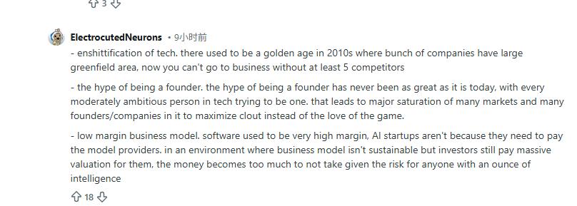 正如一位Riddit网友评道:市场正陷入“内卷粪化”,十年前处处蓝海,如今每个赛道都挤满对手。创始人头衔成为泡沫,人人创业只为刷估值、博影响力,而非真心做事。AI初创公司困于低利润模式,需要向模型商交租,商业模式本身难以为继。但当热钱仍在疯狂追逐,面对眼前唾手可得的巨额现金和有限风险,理性人谁会拒绝套现离场?