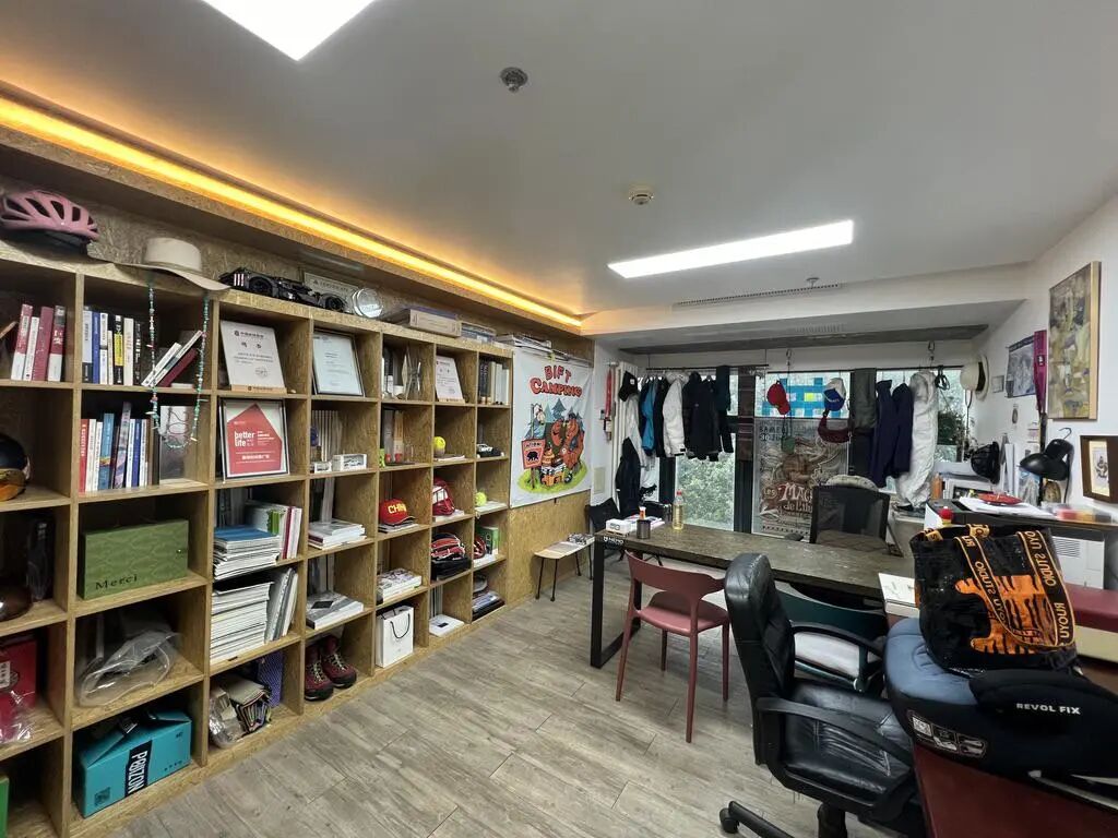 但推开他办公室的门,你很难先想到头衔,这里更像一处户外主题的策展现场:墙上挂着海报,衣架上排满硬壳软壳,书架旁立着四副双板。一屋子色彩线条中,最扎眼的,是他脸上那副亮紫色镜框。