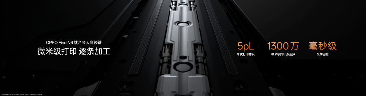 「新一代钛合金天穹铰链」,率先打破传统精密加工的极限。铰链采用行业首个仿生对称四轴结构,相较传统三轴铰链,扭力提升 20% 的同时,让铰链表面起伏从 0.18 mm 降至 0.1 mm,支撑面更广、受力更均匀,开合手感丝滑如一。但 0.1 mm 的起伏依然不够,OPPO 追求的是极致的平整。为此,OPPO 开创性地将芯片领域的精密加工技术应用于铰链制造,带来行业首创「芯片级高分子 3D 打印技术」,让铰链中板平整度至高提升 75% ,将微观天堑化为坦途。OPPO 更打造了行业首个专为平整而生的产线,让每一台 Find N6 的铰链都拥有极致统一的平整表现。