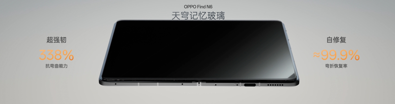 与天穹铰链形成完美协同的是 OPPO 全新研发的「天穹记忆玻璃」。针对传统柔性玻璃反复弯折后不可逆的形变难题,天穹记忆玻璃采用超坚固新型基材,至高可承受 5 公斤重压。通过深度化学强化工艺,让抗弯曲形变能力提升至传统柔性玻璃的 338%,弯折后可实现 99.9% 的形状自修复,如同记忆枕一般,展开后折痕可快速回弹淡化,成为屏幕久用平整的核心保障。