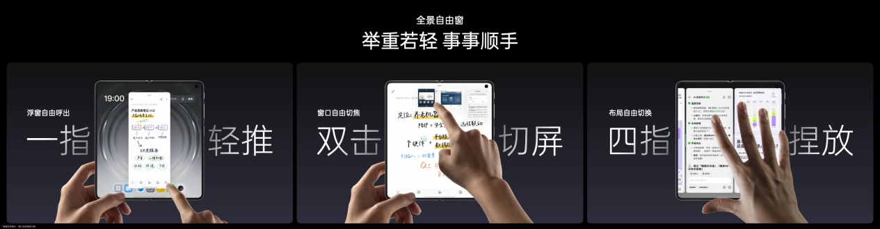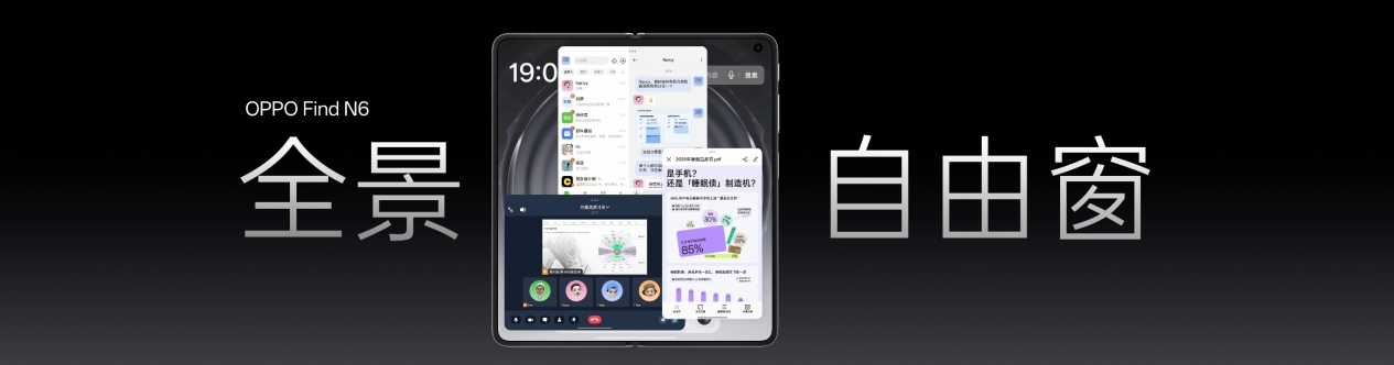 OPPO Find N6 更带来全面升级的全景自由窗分屏方案,彻底打破传统分屏的僵硬边界,实现了超越 PC 级的多窗口自由体验。用户只需一根手指,从边角向内轻推即可将应用从全屏变为浮窗,一推一拉就能无极调节窗口大小与比例;四指捏放即可在分屏与浮窗布局之间秒切,真正实现轻松拿捏多任务。全景自由窗最多支持 4 个应用窗口同时开启,可自由平铺、堆叠、悬挂,投资看盘、会议办公、合同对照等场景都能找到最顺手的布局解法。