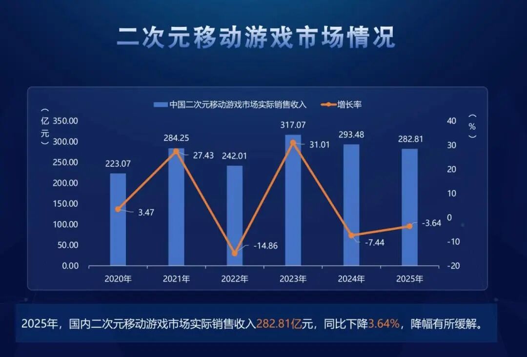 如今的二游市场的竞争可谓相当激烈,稍微平庸一点的产品背后面临的大概率都是万丈深渊。《2025年中国游戏产业报告》显示,2025年国内二次元移动游戏市场实销收入282.81亿元,同比下降3.64%,为连续第二年下滑。