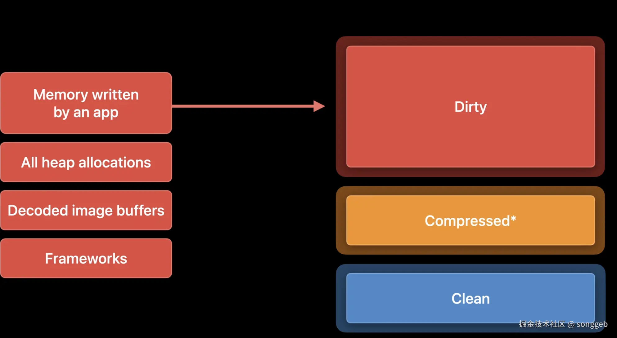 Dirty memory consists of memory written by your application. It also includes all heap allocations such as when you use malloc, decoded image buffers, and frameworks.