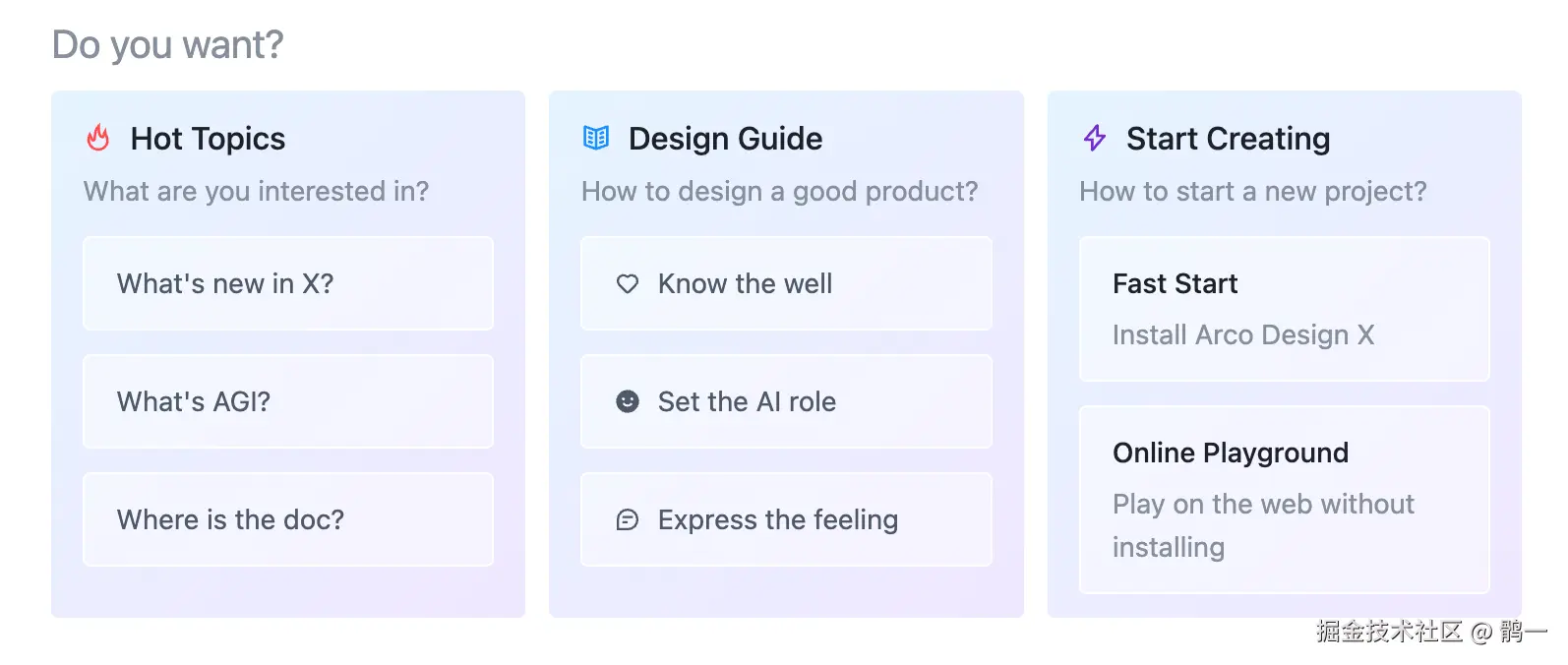 Prompts 组件是一个提示词列表组件,通常用于 AI 应用中展示预设的问题或提示,用来: