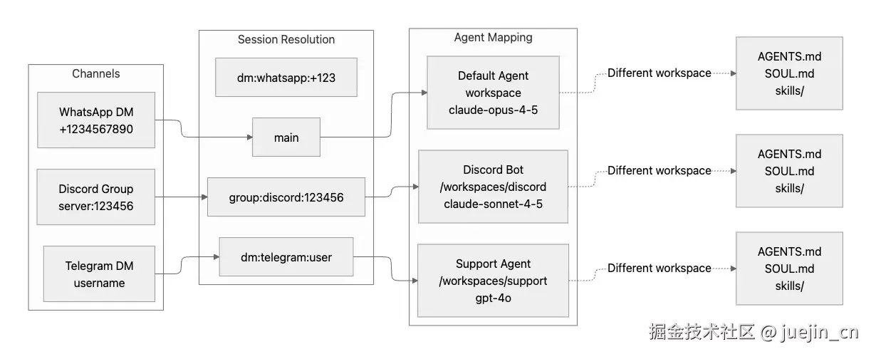 每个消息平台(通过 Baileys 库连接的 WhatsApp、通过 grammY 连接的 Telegram、使用 discord.js 连接的 Discord)都通过这个中心点进行连接。CLI 工具、Web 界面和移动应用都作为 WebSocket 客户端进行连接。当有入站消息到达时,网关会通过访问控制检查进行路由,确定哪个会话应该处理该消息,并将其分派给相应的智能体。它协调系统状态,包括会话、在线状态指示器、健康监控和定时任务。并且至关重要的是,它通过为任何非回环绑定(non-loopback bindings)执行令牌或密码认证来强制执行安全性,并为直接消息(direct messages)实现配对系统。
