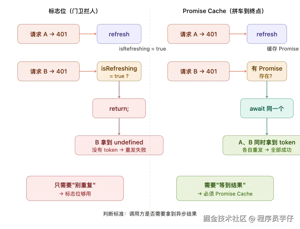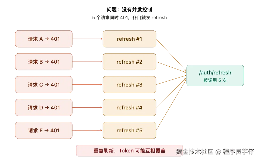 说实话,双 Token 是不是"最佳实践",社区一直有争论——有人觉得在自家系统里是过度设计,滑动续期就够了;也有人觉得职责分离确实更安全。这个争论不是本文的重点,但双 Token 的前端实现确实是最能体现并发问题的场景——因为它涉及"Token 过期后静默刷新并重发请求",而这个过程很容易在并发时出 bug。