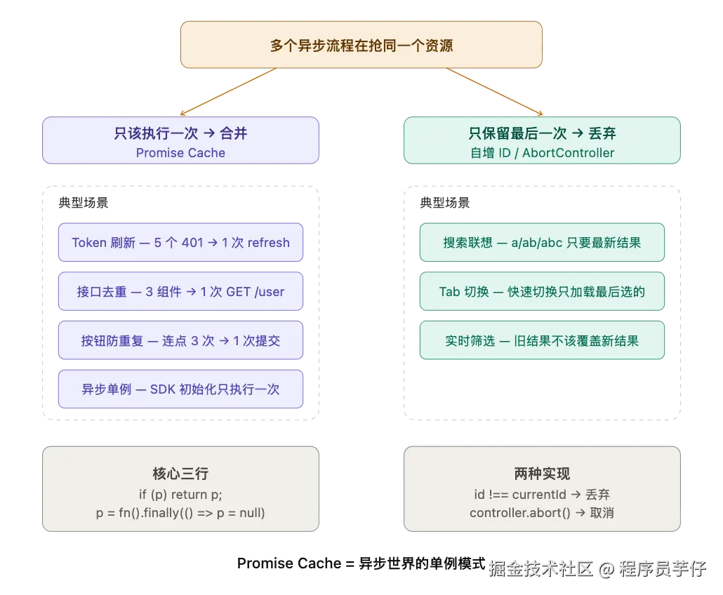 这些问题看着各不相同,但背后其实是同一件事——多个异步流程在抢同一个资源。而解决它们的核心思路,往往只需要一个 Promise。