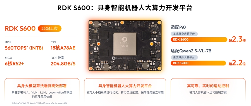 同时,现场还展示了地瓜机器人最新的具身智能机器人大算力开发平台S600,其采用大小脑架构,算力达560 TOPS*(INT8),并支持VLA、VLM等大模型端侧部署。在运行Pi0、Qwen2.5-VL-7B等模型时,其性能达到主流平台的2.2倍以上,能够满足复杂场景下的决策需求。